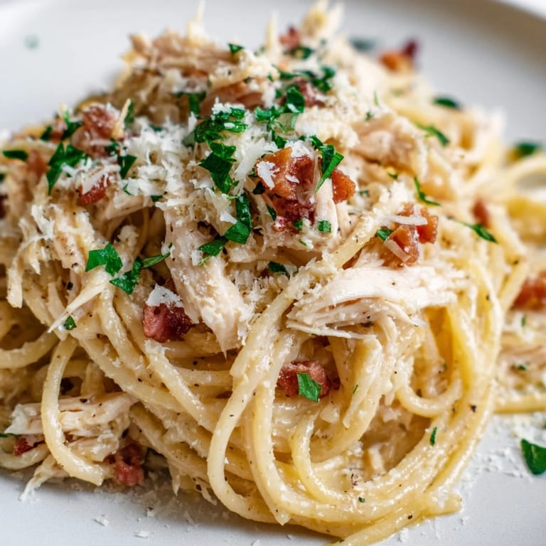 Save My neighbor knocked on the door one Tuesday evening holding a bottle of wine and an empty stomach. I had twenty minutes before she arrived and a fridge full of leftovers: some roast chicken from Sunday, bacon that needed using, and eggs. What came together that night was this chicken carbonara, born out of necessity and a refusal to order takeout. The crispy bacon fat mingled with silky egg and sharp Parmesan in a way that made her pause mid-sentence. She asked for the recipe before her plate was even empty.